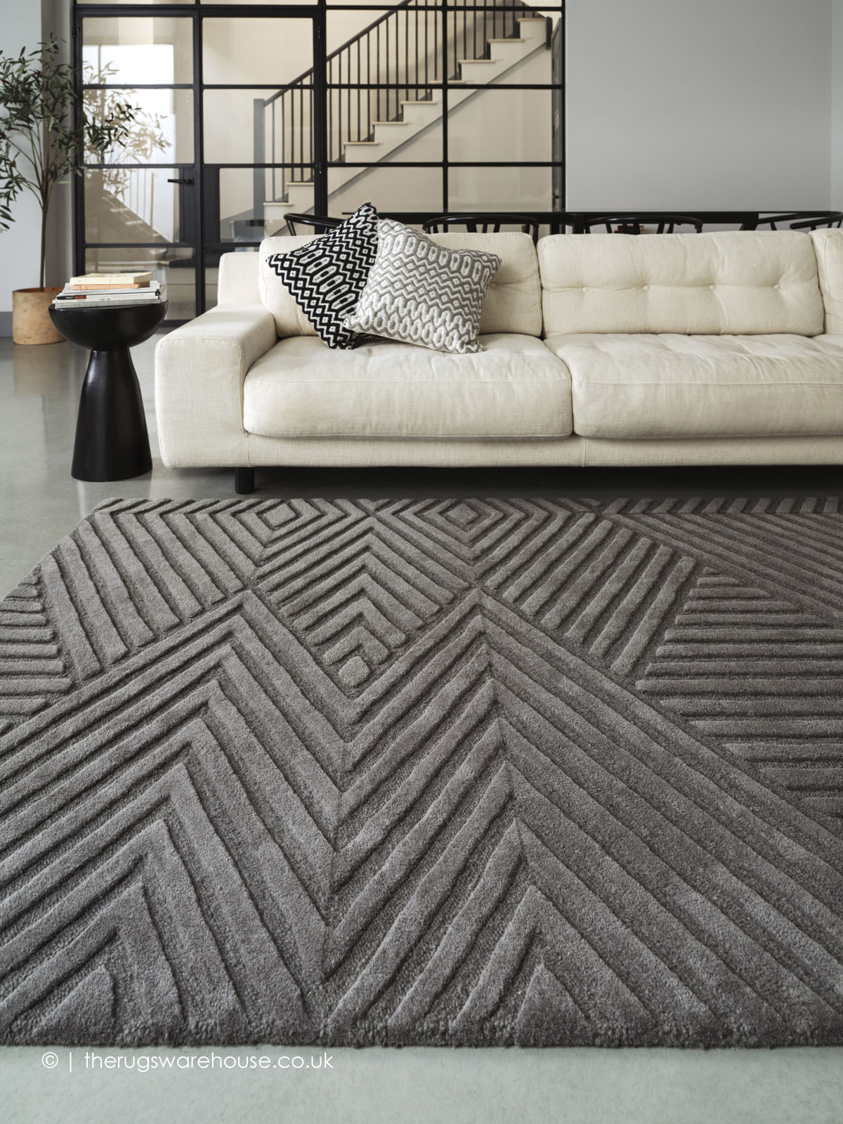 This item is part of the Hague Rugs collection, which is a range of modern hand-carved wool carpets. The collection features pieces in solid colours with sharp sweeping lines and curved geometric patterns in the high-density pile. This carving technique creates a 3D (three dimensional) effect in the deep pile, which augments the design and enhances the colours. In addition, the Hague rugs are made from wool and are very soft to the touch.